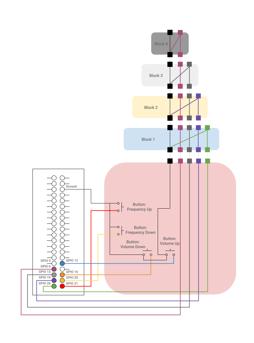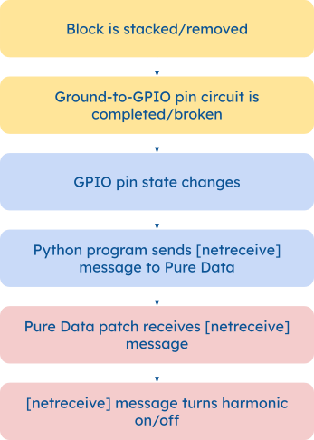 When the blocks connect to Raspberry Pi GPIO pins, a Python program sends a message to a Pure Data synthesizer patch.