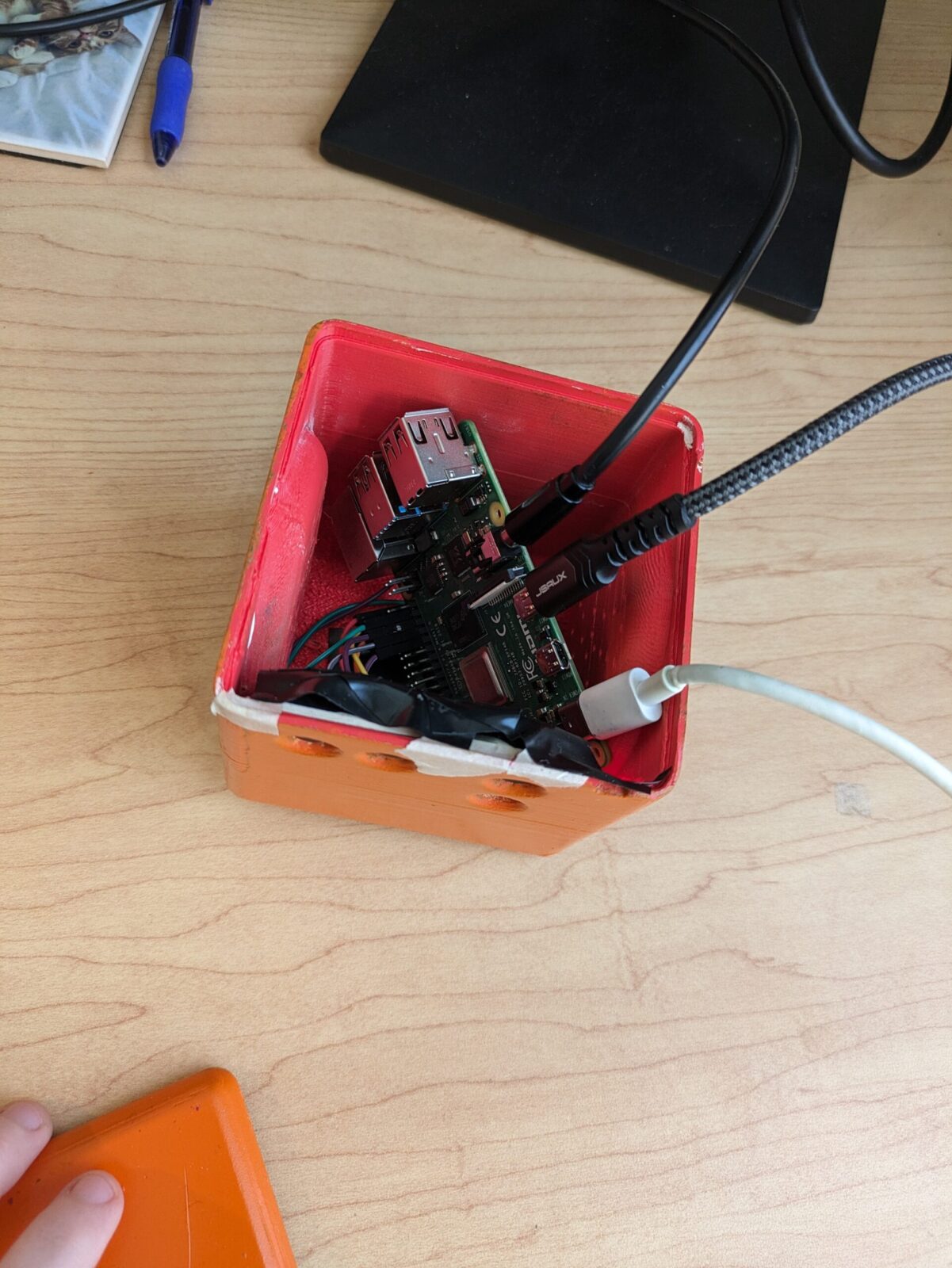 The bottom cap is not on in the demonstration because the HDMI and audio outputs are being used for demonstration purposes. The program can be run without a GUI, and in a more finalized version, would have an internal speaker.
