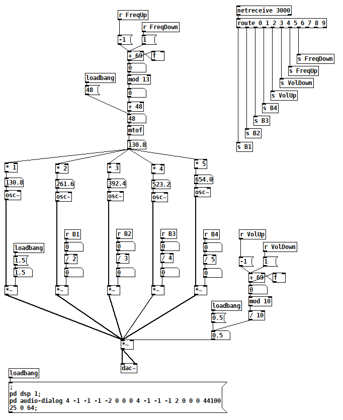 The frequency of the fundamental and the overall volume are controlled by the [netreceive] messages from up/down buttons