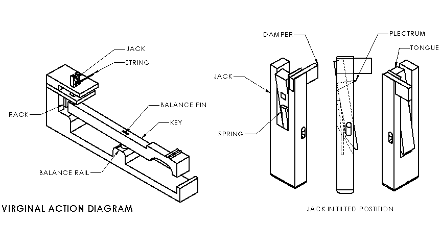 Harpsichords and virginals are plucked chordophones. Their action [see Figure D] consists of a key-lever pivoting on a balance pin. Pressing the key-lever raises a jack from its rest-position. The jack consists of a body, tongue and plectrum and damper. As the jack is raised, the slightly flexible plectum is forced upwards into and past the string, plucking it. Releasing the key-lever allows the jack to fall back to rest position, where the damper mutes the string. The string is not replucked on the return, as when the plectum falls down onto the string, the tongue is allowed to pivot backwards, allowing the plectum to pass behind the string without it sounding. This mechanism includes a damper, which allows for the keypress to control the time for which a note rings out, and also produces a significantly louder sound than tangent-struck instruments like the clavichord, but does not allow for any variation in volume.