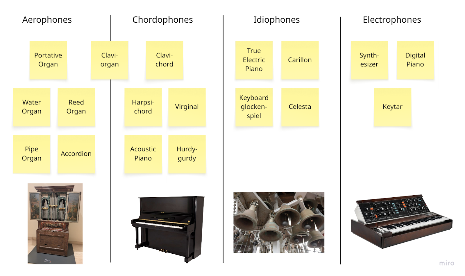 Keyboard instruments fall into four main categories: chordophones (sound produced by vibrating strings), aerophones (sound produced by a vibrating air body), idiophones (sound produced by the vibration of the instrument itself – in the context of keyboards, this is typically a vibrating ‘tongue,’ or a sort of bell), and electrophones (sound produced electronically). Figure A shows examples of instruments in each category. In addition to the large variety of available instruments, smaller and portable keyboards were also commonplace in antiquity. For example, the pipe organ is an aerophone that can be incredibly large (the Boardwalk Hall Auditorium Organ weighs 150 tons (Smith 2002)). However, a variety of smaller forms exist, the smallest of which is the portative organ [Figure B]. These were popular late medieval and renaissance instruments (Pittaway 2018). The harpsichord is a plucked chordophone that was popular in the renaissance and baroque periods. The standard version of these instruments was similar in form to, but slightly smaller than the modern grand piano. Smaller, and even folding variations of this instrument also existed [Figure B]. The virginal was a variant of the harpsichord, differentiated by the angle of the strings to the keyboard, which allowed it to be built incredibly small. The clavichord, a struck chordophone, was commonly used from the late middle ages into the baroque and classical periods. While there was no smaller version of the clavichord, the instruments were generally quite small. The initial usage of clavichords was most likely for teaching vocals and other instruments, but the instrument did become popular in its own right. Its benefits included “stability of tuning and mechanism… low cost and portability, and, very likely, the softness of its tone – so low that one can play it without disturbing others nearby” (Koster, Kirk, and Germann 1994, xiv).