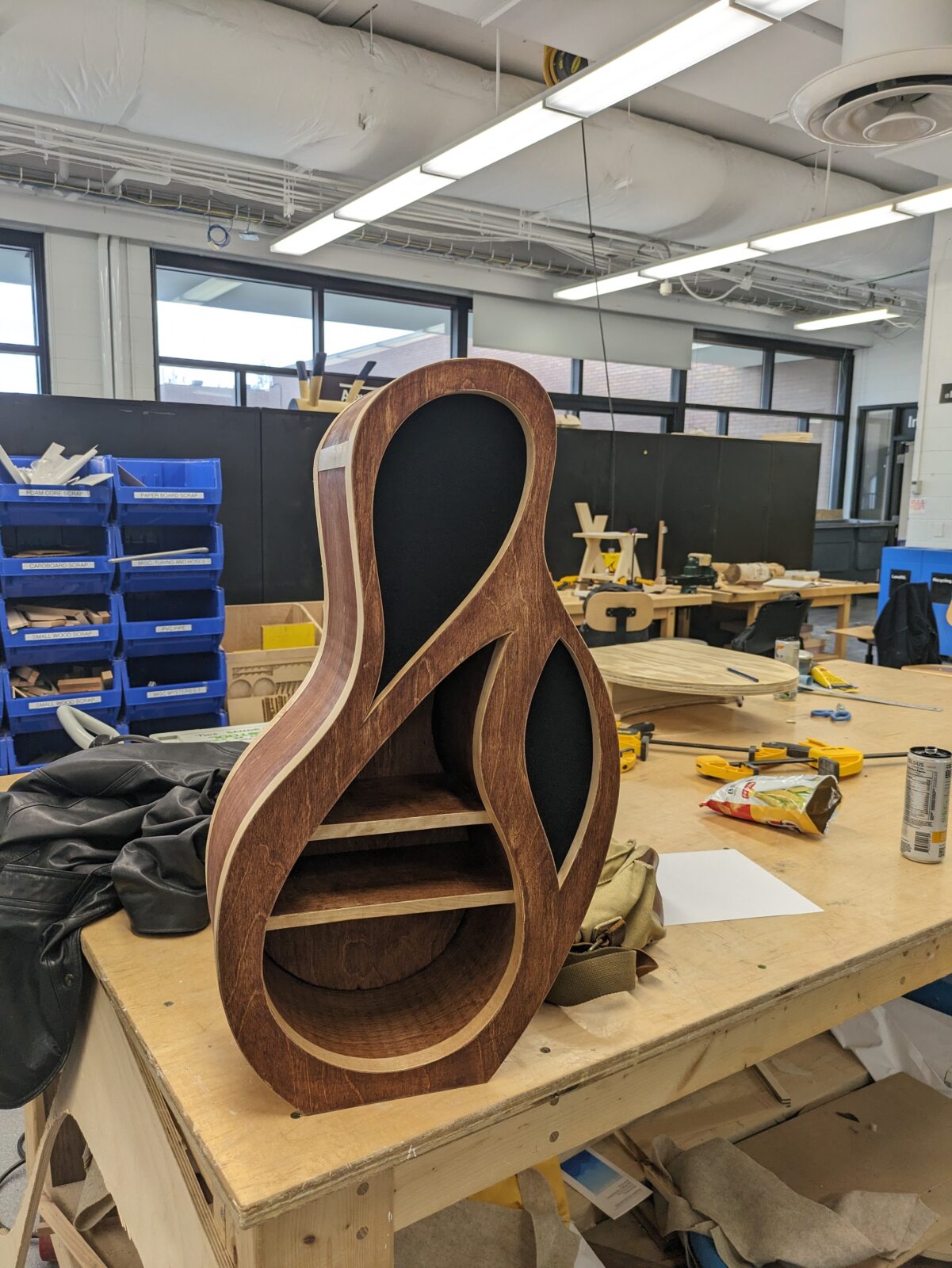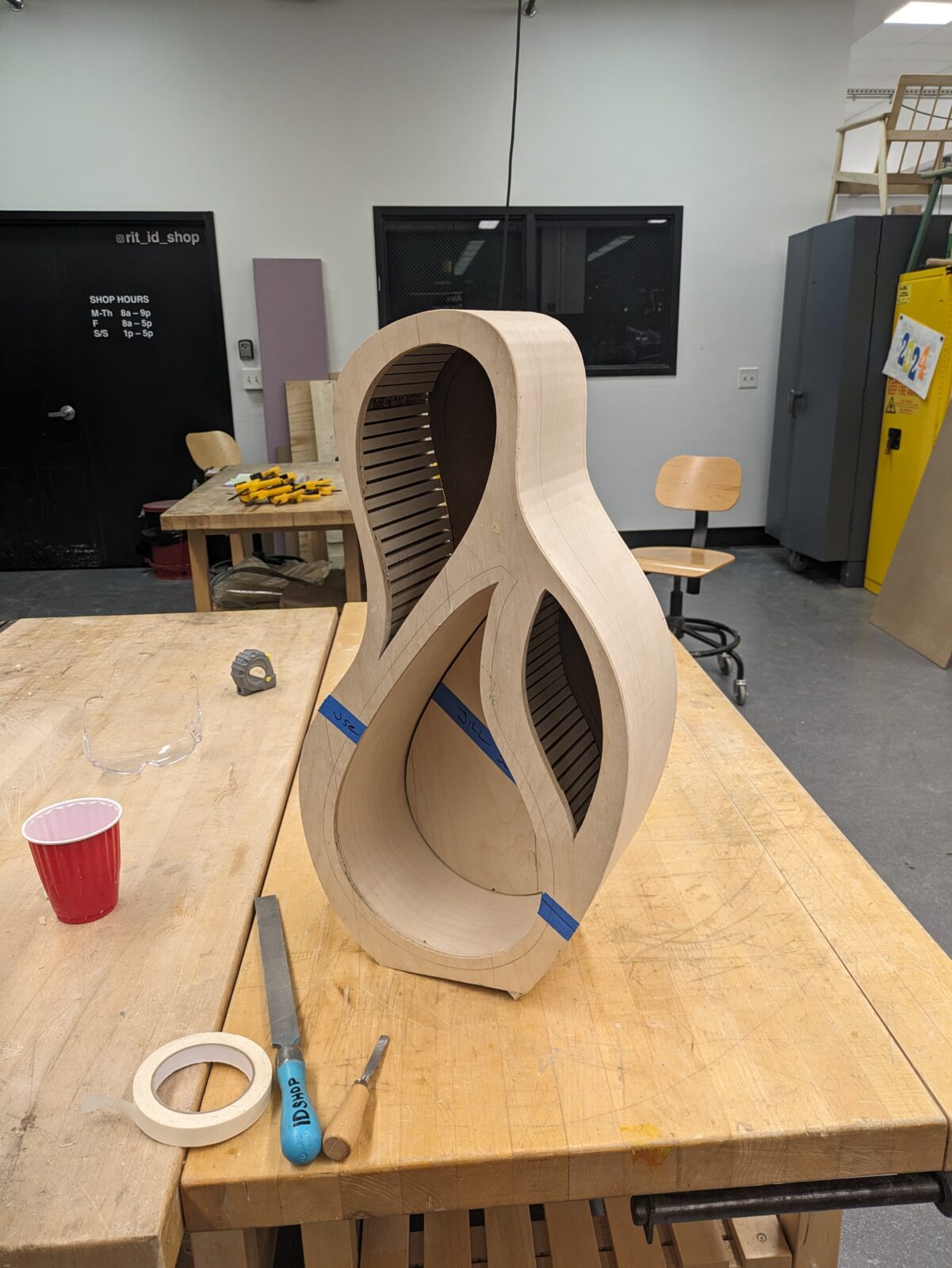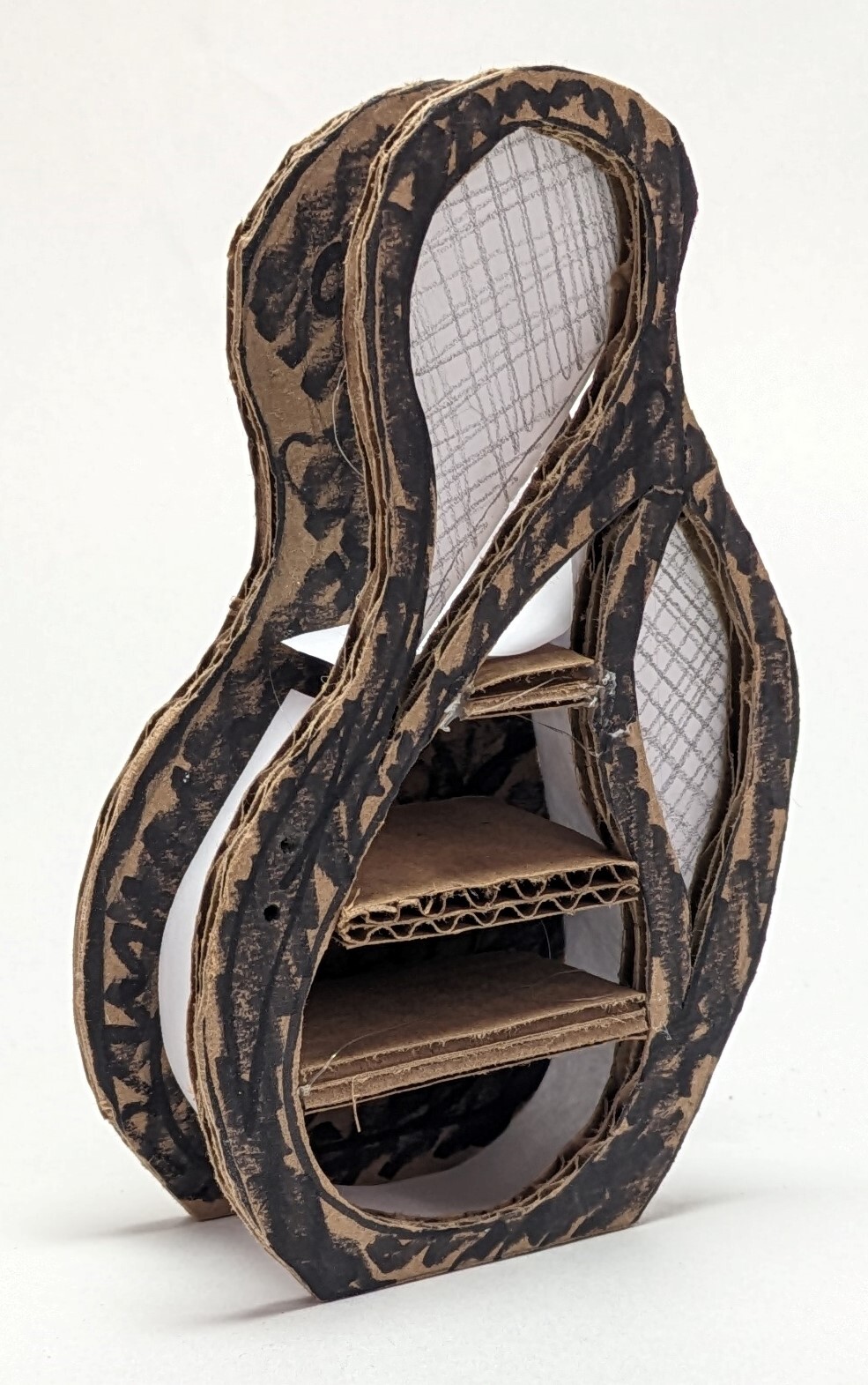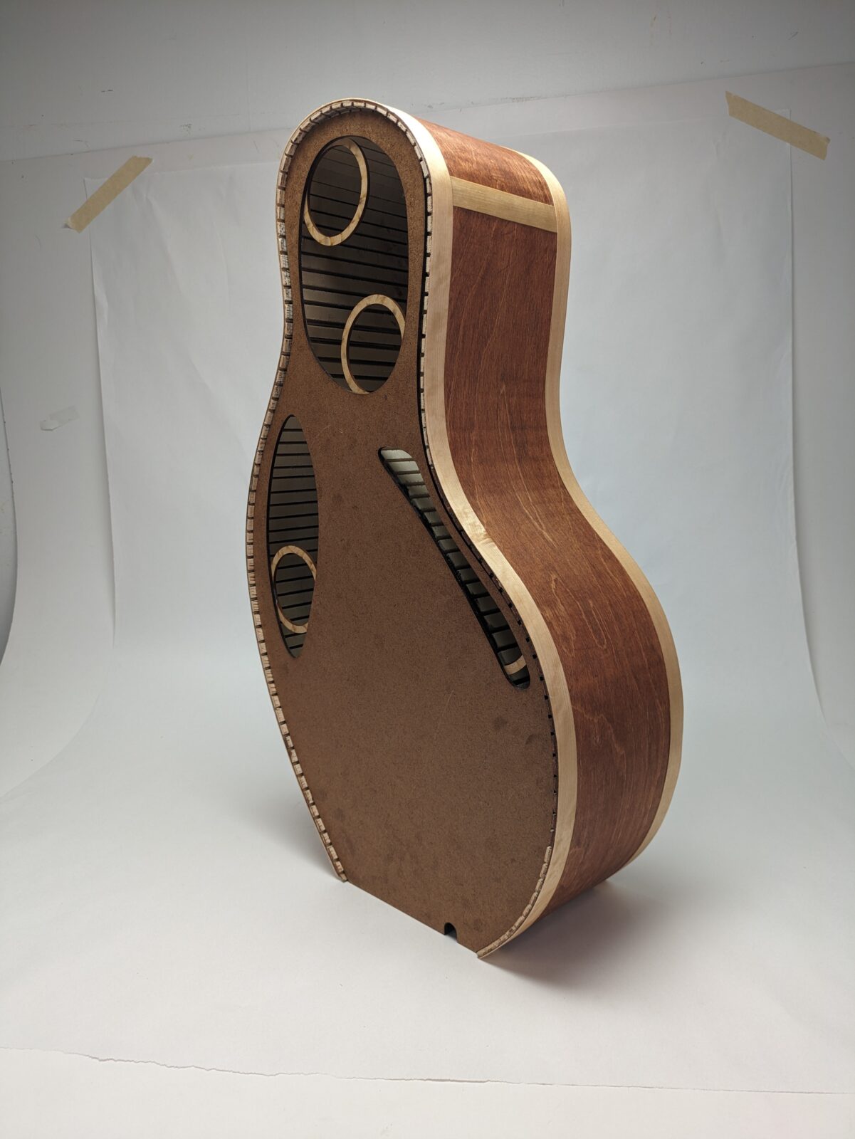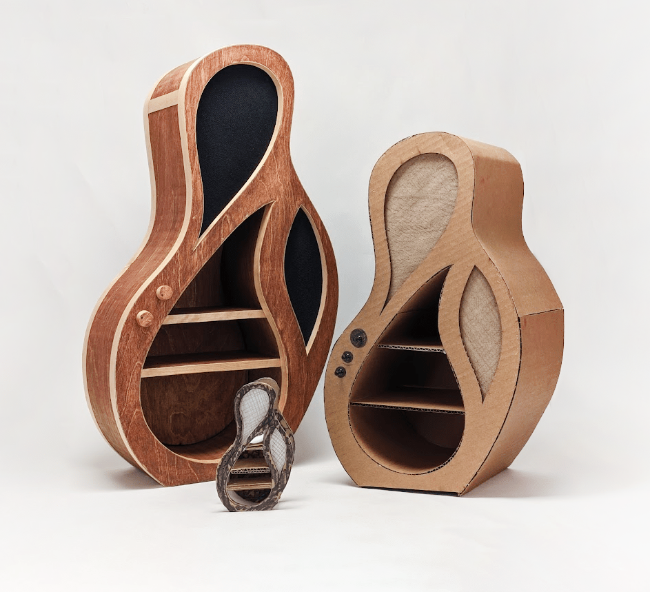 The construction techniques and shape of the cabinet was inspired by acoustic guitars. I made several sets of prototypes throughout the building process, first by hand, and then using laser-cut cardboard.