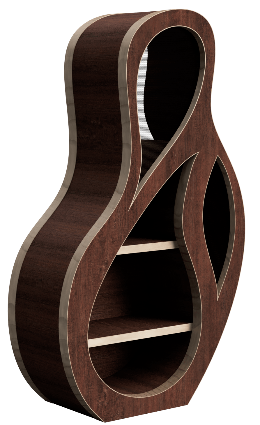 I used laser-cut routing templates to route the front plate, as well as to check curvatures of the sides. The sides were made from kerf-cut plywood sheets which were dampened to help them curve. They were fit into routed channels on the front plate. The back plate was fitted into a rabbet on the sides. Banding was added to the edges, and the speaker cavities were covered with speaker grill.